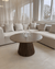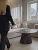 Den runde bordplade i egefiner giver et blødt og indbydende udtryk, mens den karakteristiske lamelfod giver et moderne præg.